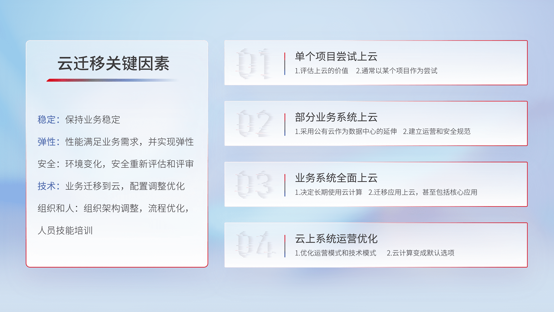 结合实际业务,,,,从规划设计、、、云平台选型、、、、云原生改造、、、、数据迁移、、、、集成交付,,迁移全过程为客户识别最佳上云路径,,做好风险识别管理,,,,设计网络架构、、、身份权限、、、安全审计合规、、操作审计、、日志审计、、、监控告警策略、、、、多站点容灾设计等,,对云上基础设施进行整体规划,,,提升IT治理水平,,以满足弹性、、、高可用、、高性能的需求。。