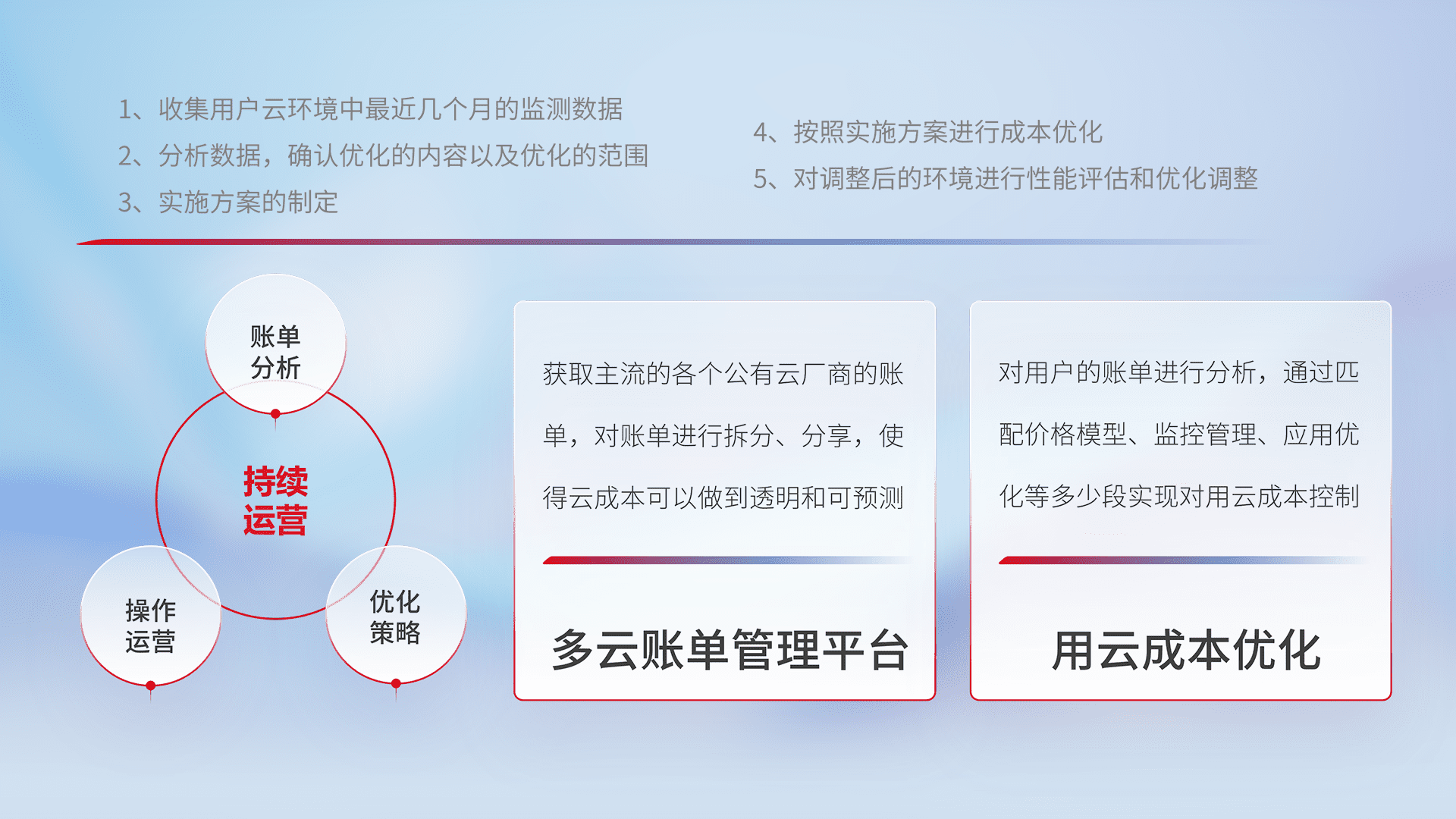 通过多云纳管,,以统一的资源数据模型把客户的云资源进行抽象和封装,,进而实现对多云资源的统一操作,,,,保障云资源管理的可靠性、、、、稳定性与可用性。。。。量身定制化运维内容,,,配置、、、、开发运维、、、、补丁管理、、、、备份、、、、监控、、、、认证和访问管理、、、审计和日常巡检等,,,保障在用云过程中的可靠度,,,稳定度以及高可用率。。